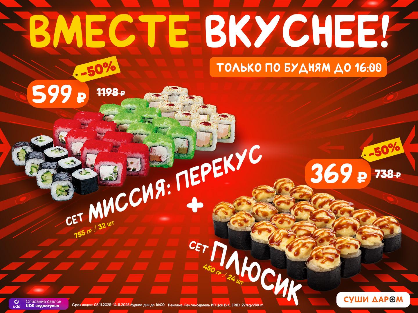 [emoji=:heart_eyes:]Представляем вашему вниманию бомбические сеты "Миссия: Перекус" и сет "Плюсик"[br]Созданы для того, чтобы твой обед был идеальным![br]Берёшь сытный сет "Миссия: Перекус" — добавляешь лёгкий запеченный сет "Плюсик".[br]И получаешь комбо, где вместе реально намного вкуснее [emoji=:yum:][br][br] Не пропусти - только по будням, только до 16:00[br][emoji=:orange_heart:] Сет " Миссия: Перекус" — 0,9 кг всего за 599 ₽[br][emoji=:orange_heart:] Сет "Плюсик" — 550 г всего 369 ₽[br][br]Срок действия акции с 5.11.2025- 14.11.2025 будние дни до 16:00[br]*Списание баллов UDS невозможно.[br]**Количество товара ограничено, наличие товара уточняйте у кассира по телефону 8 (920) 319-09-09